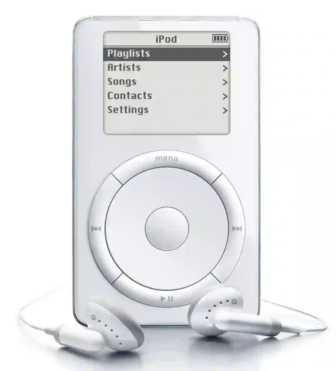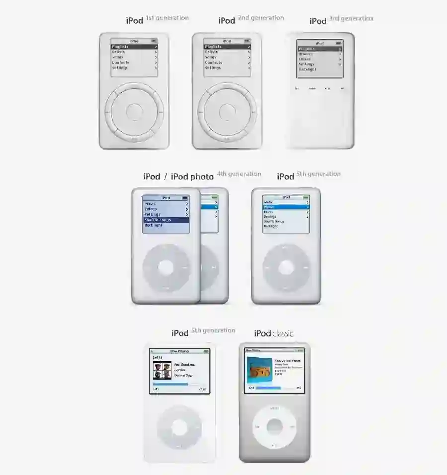 最后由大家所熟悉的苹果公司前首席设计官乔纳森·伊夫(Jonathan Ive)领导的工业设计团队来设计iPod的外观,矩形显示屏,圆形的转盘,白色聚碳酸酯的前盖,不锈钢材质的后盖,第一代iPod就此诞生。