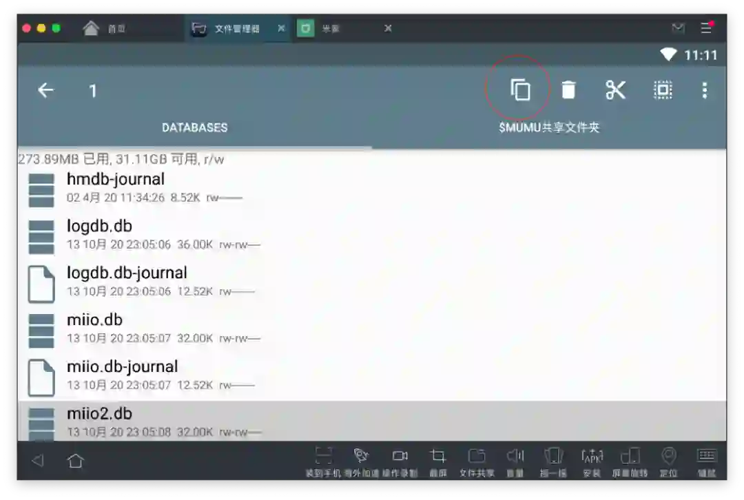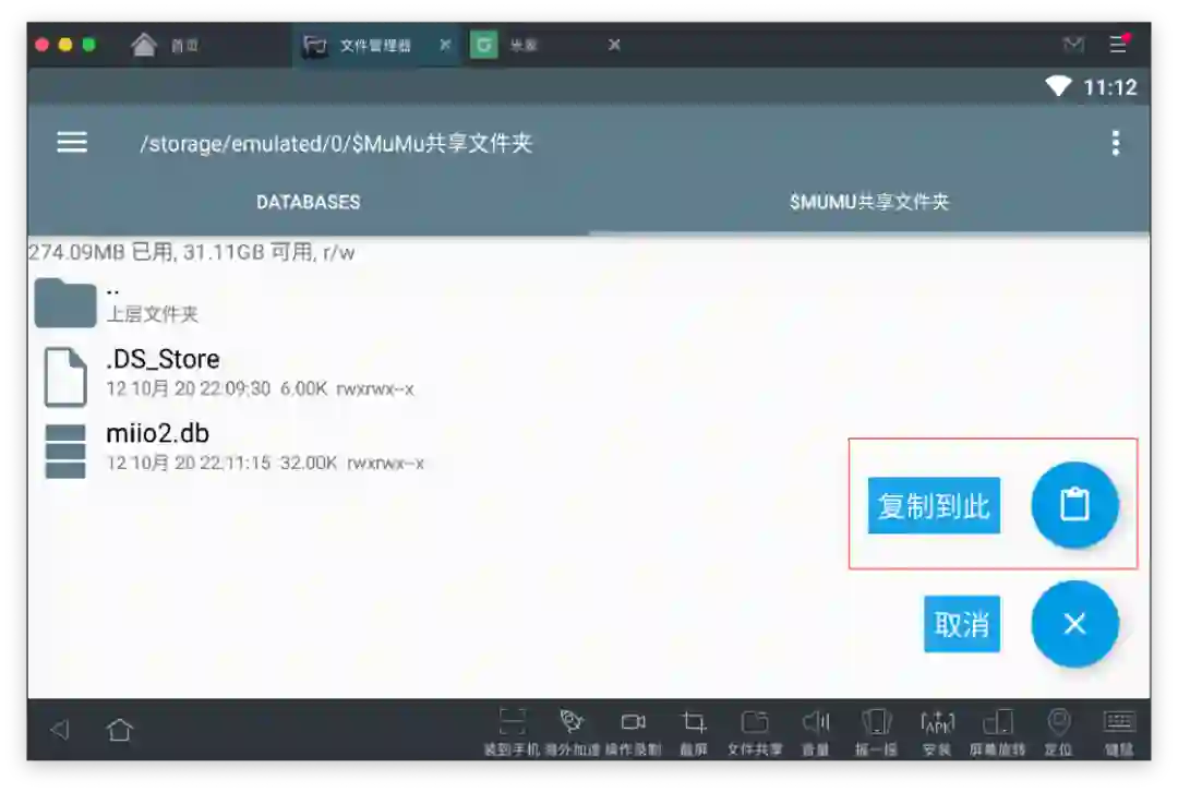 共享文件夹 找到模拟器的共享文件夹,点击右下角的「复制至此」按钮;最后,点击模拟器底部工具栏上的「文件共享」按钮就能在本地文件夹找到 miio2 文件了。