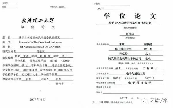 据澎湃新闻6月报道,有网友反映称,电子科技大学电子与通信工程领域2007届毕业生贾桂林2007年11月提交的硕士学位论文《基于CAN总线的汽车组合仪表研究》和武汉理工大学信息工程学院通信与信息系统专业2007届毕业生付胜波2007年4月提交的硕士学位论文《基于CAN总线的汽车组合仪表研究》两篇论文高度雷同。