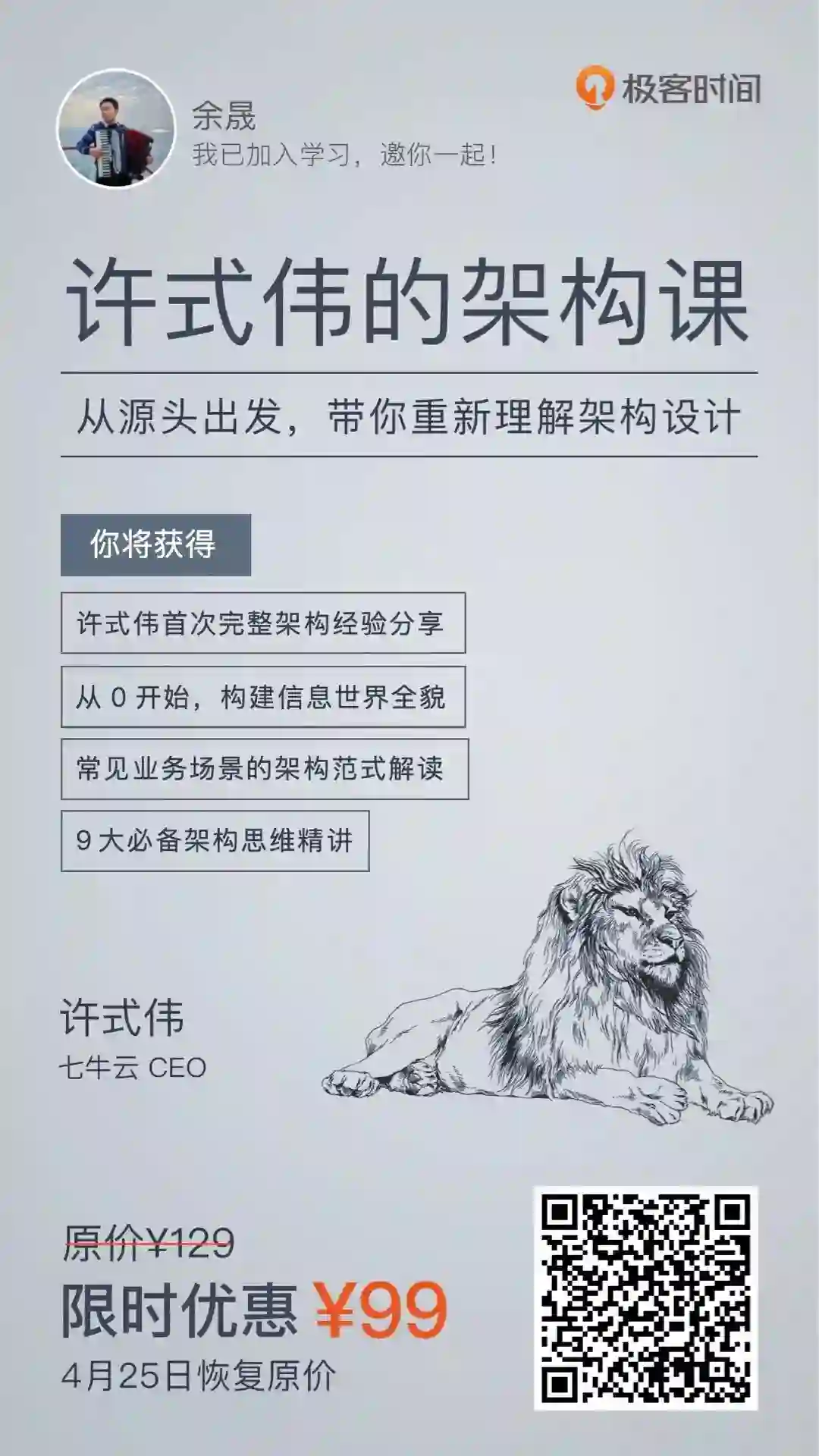 我没想到的是,这么多年过去,老许赶起了时髦,在 极客时间 开了《许式伟的架构课》。作为老同事,我觉得有义务帮他吆喝一下,这也是造福广大开发者的幸事。如果你对架构有兴趣,听听老许的经验,应当是很值得的。