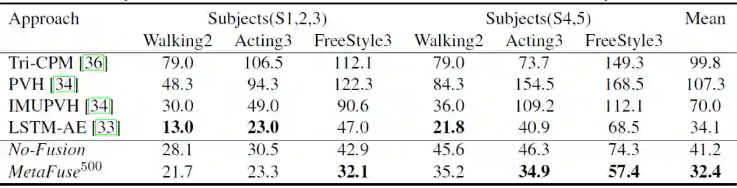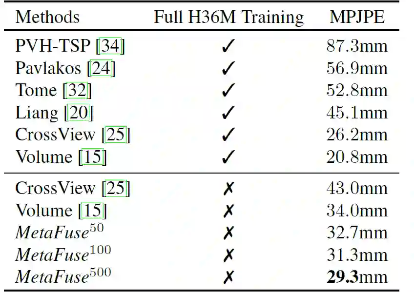 实验的训练集是 CMU Panoptic Dataset, 从中选取了20个相机的数据用于训练(Meta-Training)。测试数据集为 H36M(Human3.6M),Total Capture 数据集等。在 H36M 等数据集中,只使用少量标记数据进行微调(50~500个)。