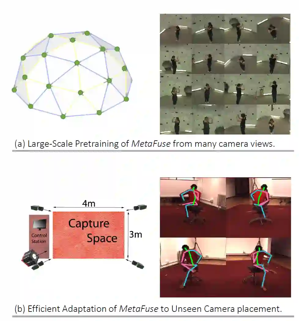 在预测 2D 坐标过程中,融合多个视角的信息可有效解决遮挡等问题。但是目前方法中,融合模型的参数依赖于特定相机对,难以泛化到新的环境。针对这一问题,本文提出将原有的融合模型分解为(1)所有相机共享的通用模型(2)针对特定相机的轻量变换矩阵。并且使用元学习算法,在大规模多相机数据中进行预训练,从而最大化模型的泛化能力。在多个公开数据集上的实验,证明了该模型(MetaFuse)在新环境中只需少量样本即可有效迁移。