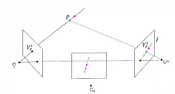 首先介绍多视角信息融合的基础知识[1]。由对极几何(Epipolar Geometry)可知,相机1中的一个像素点,在另一个相机2中,对应的像素点必定位于一条直线 I(Epipolar Line)上。因此,我们可以将直线 I 对应的特征信息,融合到该点