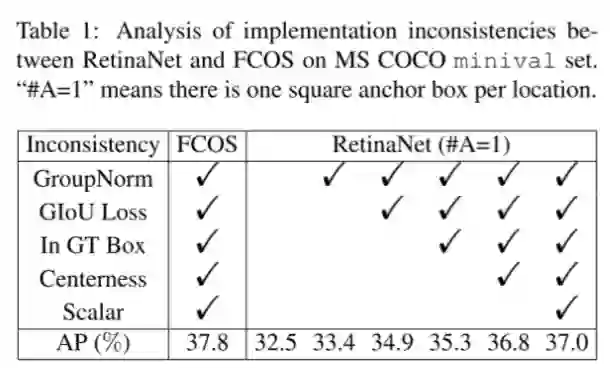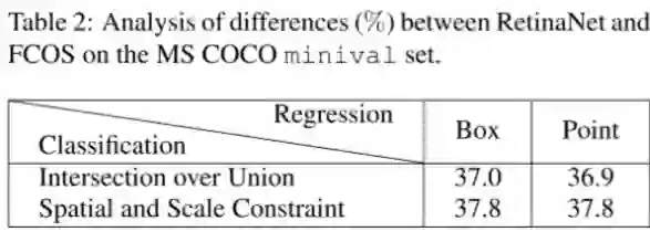 FCOS相比于只设置一个anchor先验的RetinaNet来说,COCO数据集上的mAP高差不多5个点,为了公平的比较RetinaNet和FCOS的精度差异的原因,ATSS的paper中用一致的trick对RetinaNet和FCOS进行实验。如实验所示,相同trick设置下,RetinaNet比FCOS少0.8个点,这时RetinaNet和FCOS的差别仅仅在于采样方式和回归起点的不同。