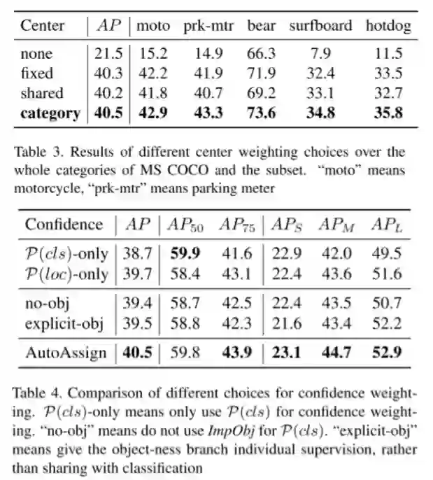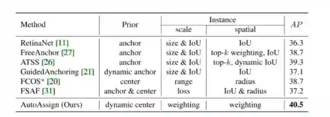 最近的AutoAssign在FCOS的基础上,通过引入ImpObj、Center Weighting和Confidence Weighting三个分支,将FCOS中根据空间和尺度定义正负样本的方式和center-ness分支都去掉,将label assign做的更加彻底,完完全全通过CNN学习自适应的label assign方式。