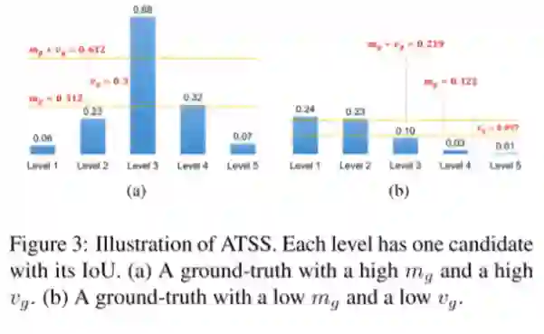 下图中显示出了ATSS对于不同分布的样本可以自适应的调整阈值,挑选到合适尺度下的正样本。