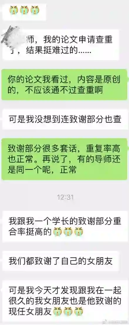 而当你自己论文查重的时候,发现自己致谢的女朋友与学长致谢的女朋友是同一个人的时候,这是一种什么体验?