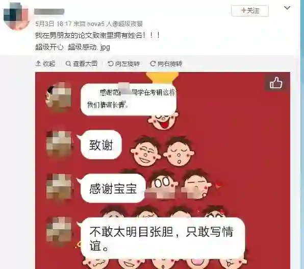 当然,也有为自己名字出现在男朋友毕业论文致谢中而开心雀跃的,这样的女朋友也太可爱了吧。