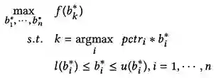 如公式(5)所示,我们希望在满足广告主诉求的调价范围内进行调价,使得ECPM排序机制(如公式(5))下最优的广告,其综合指标函数f()的值也最大。该优化问题的主要求解方法请参见KDD 2017收录的论文原文: Han Zhu, Junqi Jin, Chang Tan, Fei Pan, Yifan Zeng, Han Li, Kun Gai. Optimized cost per click in Taobao display advertising. ACM SIGKDD 2017. (地址见文末)