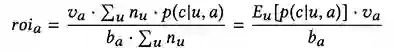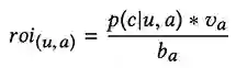 即单次点击的期望投资汇报率为期望GMV除以单次点击价格。进而,广告a对于不同用户和点击的ROI如公式(2),即平均转化率乘以比单价除以单次点击价格,其中na是某个用户在一段时间内的点击量。