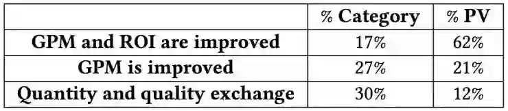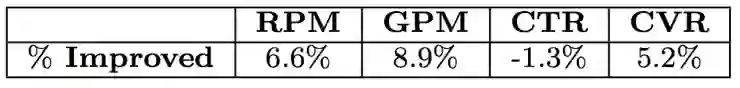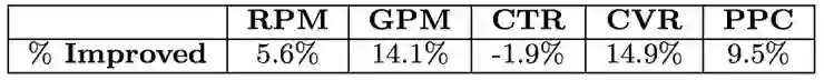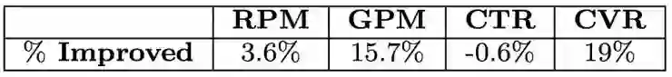 除了单品广告场景,该算法在淘宝移动端首页顶部的Banner广告中也明显提升了商家的成交额和转化率,如表4。从商品的类目视角分析,表5的数据表明17%的类目(占62%的浏览量)流量的商家GPM和ROI获得了同时提升,27%的类目(占21%的浏览量)流量的GPM获得了提升,另有30%的类目(占12%的浏览量)显示出流量数量和质量的置换(与单品广告分析相似,其转化效果也获得了提升)。