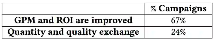 持续一周的线上生产环境效果分析表明,OCPC使得67%的广告主制定的广告计划(Campaign)的千次展现成交额(GPM)和广告投资回报率(ROI)同时获得了提升,如表3。另有24%的广告计划显示出流量数量和质量的置换现象(Quantity and quality exchange),其含义是:这类广告主由于获得了更多的流量,拉低整体平均ROI下跌。但是,由于其整体流量增幅高于平均ROI跌幅,这些广告主的成交转化数都获得了提升。