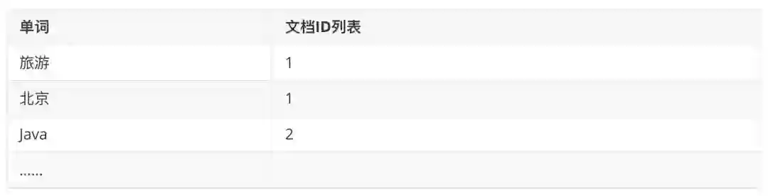 全文搜索引擎是使用倒排索引技术,建立单词到文档的索引,例如上面的表信息建立倒排索引: