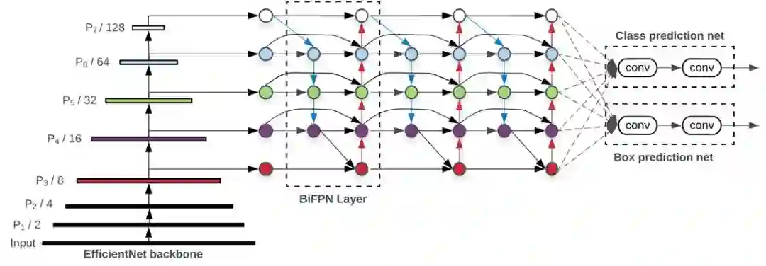 图 3:EfficientDet 架构。它使用 EfficientNet 作为主干网络,使用 BiFPN 作为特征网络,并使用共享的边界框/类别预测网络。