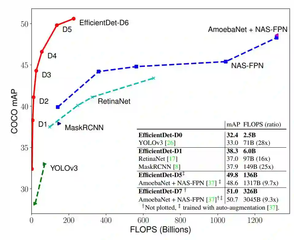图 1 和图 4 展示了多个模型在 COCO 数据集上的性能对比情况。在类似的准确率限制下,EfficientDet 的 FLOPS 仅为 YOLOv3 的 1/28、RetinaNet 的 1/30、NASFPN 的 1/19。