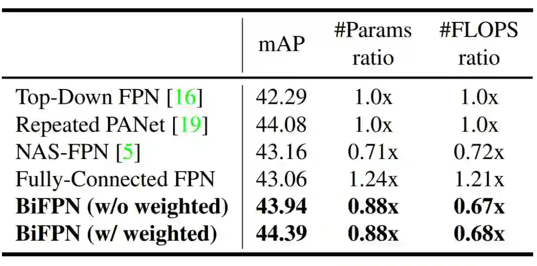 表 4:不同特征网络的对比情况。加权 BiFPN 以更少的参数和 FLOPS 取得了最好的准确率。