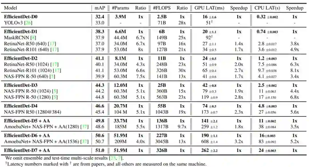 表 2:EfficientDet 在 COCO 数据集上的性能。#Params 和 #FLOPS 表示参数量和 multiply-add 次数。LAT 表示在批大小为 1 时的推断延迟。AA 表示自增强。研究者将准确率类似的模型归类在一起,并对比了每一组中 EfficientDet 与其他检测器的比例或加速。