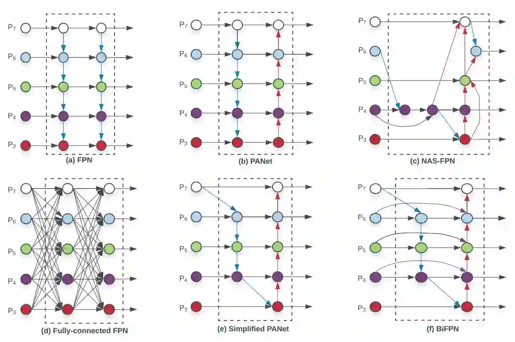图 2:特征网络设计图。a)FPN 使用自上而下的路径来融合多尺度特征 level 3-7(P3 - P7);b)PANet 在 FPN 的基础上额外添加了自下而上的路径;c)NAS-FPN 使用神经架构搜索找出不规则特征网络拓扑;(d)-(f) 展示了该论文研究的三种替代方法。d 在所有输入特征和输出特征之间添加成本高昂的连接;e 移除只有一个输入边的节点,从而简化 PANet;f 是兼顾准确和效率的 BiFPN。