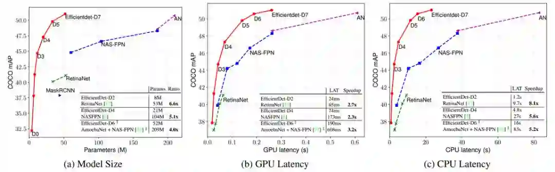 近年来,在实现更准确的目标检测方面出现了大量进展,然而当前最优目标检测器的成本也越来越高昂。例如,近期提出的基于 AmoebaNet 的 NASFPN 检测器需要 167M 参数和 3045B FLOPS(是 RetinaNet 的 30 倍)才能获得当前最优准确率。大模型规模和昂贵的计算成本阻碍了它们在一些现实世界应用中的部署,例如模型规模和延迟高度受限的机器人、自动驾驶汽车等应用。由于这些现实世界的资源限制,模型效率对于目标检测的重要性越来越高。