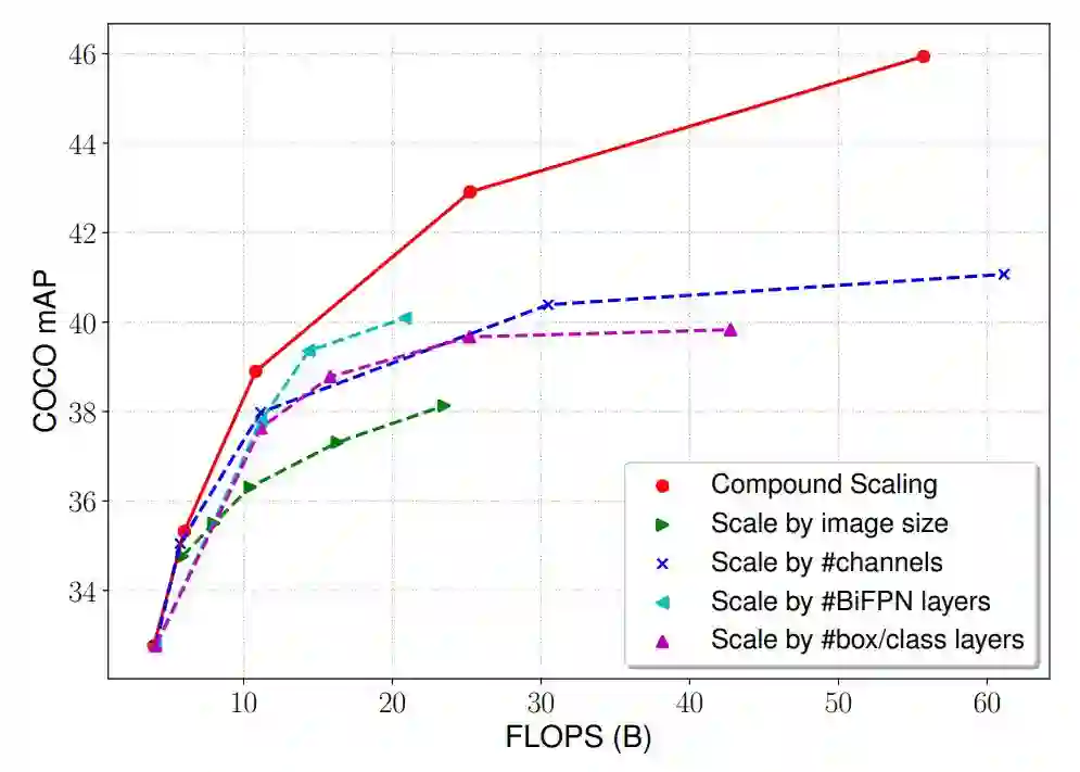 研究者使用复合缩放方法,统一扩大主干网络、BiFPN 和边界框/类别预测网络的所有维度——深度/宽度/分辨率。图 6 对比了该复合缩放方法和其他仅扩大其中一个维度的方法。