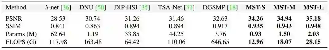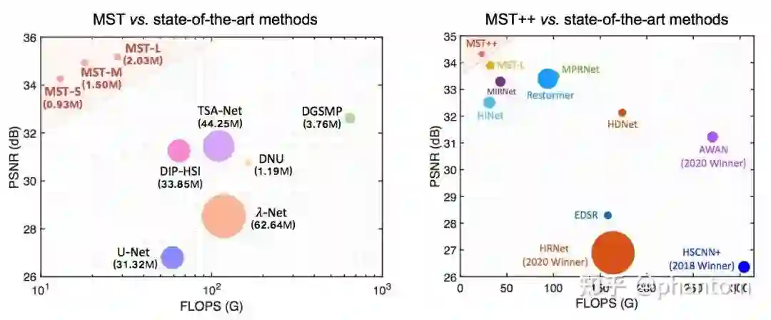 先验货,MST 与 MST++ 与 SOTA 方法对比如图1所示,很轴为计算量,纵轴为性能,圆半径代表参数量。MST 与 MST++ 占据了左上角,参数量也非常小,实现多快好省的高光谱图像重建。