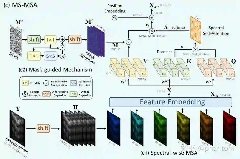 其中的 MS-MSA 又可以拆解为两部分,即 Mask-guided Mechanism (MM) 和 Spectral-wise Multi-head Sefl-Attention (S-MSA)。为了避免大家觉得枯燥无味,这里就不给大家看比较琐屑的公式了。下面我会用语言大概介绍一下,相关细节请参照原文。MS-MSA的结构如图5所示
