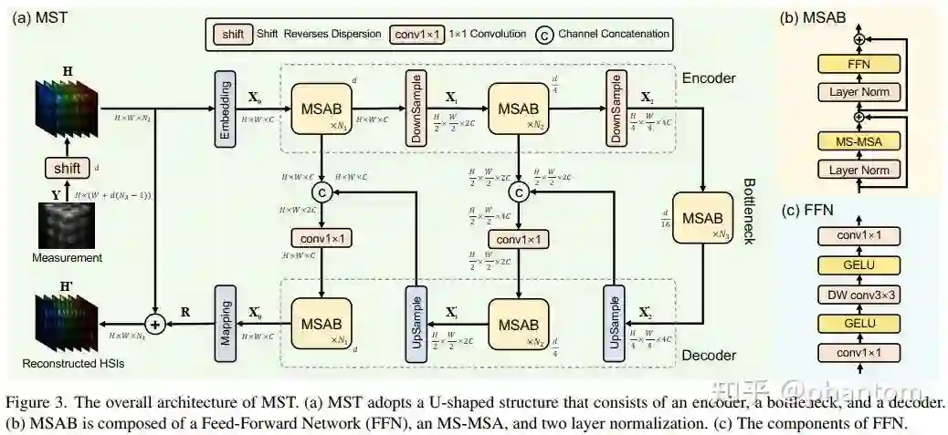 针对从 2D measurement 到 3D HSI cube 的光谱图像复原,我们提出了 Mask-guided Spectral-wise Transformer (MST),如图3 (a) 所示。MST是一个对称的 U 形的网络,其基本组成单元为 Mask-guided Self-Attention Block (MSAB), 如图3 (b) 所示。MSAB 中最重要的就是 Mask-guided Spectral-wise Multi-head Self-Attention (MS-MSA)。MSAB 包含两个 Layer Normalization (LN),一个 MS-MSA 和一个前向神经网络 Feed Forward Network (FFN),如图3 (c) 所示。