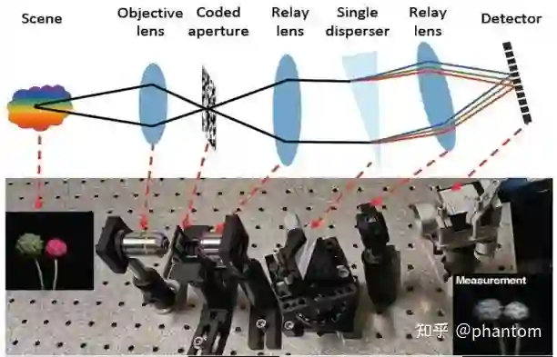 那么既然高光谱图像那么有用,我们应该如何获取它呢?传统的成像设备采用光谱仪对成像场景进行空间域通道维度的扫描,费时费力,不适用于运动场景。近些年,科学家们专门设计了快照压缩成像(Snapshot Compressive Imaging,SCI)系统来解决这一问题。在诸多SCI系统当中,编码孔径快照光谱成像(Coded Aperture Snapshot Spectral Imaging)系统脱颖而出,成为捕获获取光谱图像的重要手段,其结构如图2所示