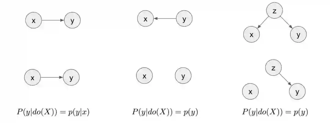 第一行的三个图描述了这三个脚本。第二行是变换后的图,在这些图中删除了所有指向 x 的边。在第一个脚本中,图在变换前后看起来是一样的。从这一点看,我们可以总结出 p(y|do(x))=p(y|x),也就是说在 x=3 时的 y 的分布和在 x=3 时的 y 的条件分布是一样的。在第二个脚本中,在变换后 x 和 y 中不再有任何连接,因此它们是相互独立的。从这一点看,我们可以总结出 p(y|do(X=3))=p(y)。改变 x 的值对 y 的值不会产生影响,所以无论你将 x 设置为多少,y 都只是从它的边际分布中抽样得到的。这一点也适用于第三张因果图。