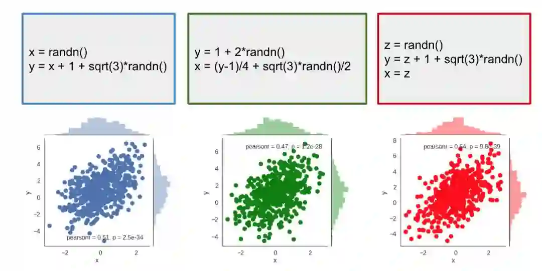我通过反复执行这些脚本绘制了样本点。如你所见,这三个脚本在 x - y 坐标图上生成了相同的联合分布。你可以将这些分布馈送到 two-sample test 中,然后你就会发现它们确实很难区分。