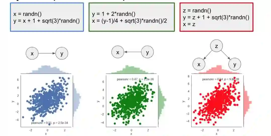最后,你可以用不同的发现因果关系的技术来尝试从数据本身识别因果图。理论上讲,一般情况下是无法通过数据恢复完整的因果图的。但是如果你添加了一些额外的平滑度或独立性假设,就能够以一定的可靠性从数据中恢复图。