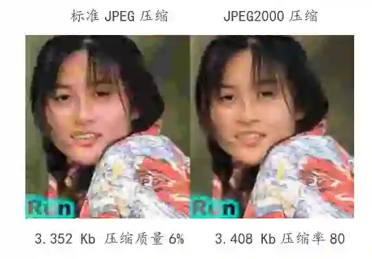 整体来说,JPEG2000 相比于传统 JPEG,仍有很大技术优势,通常压缩性能可提高 20% 以上。当压缩比达到 100:1 时,JPEG 压缩的图像已经严重失真并开始难以识别了,而 JPEG2000 的图像仍可识别。