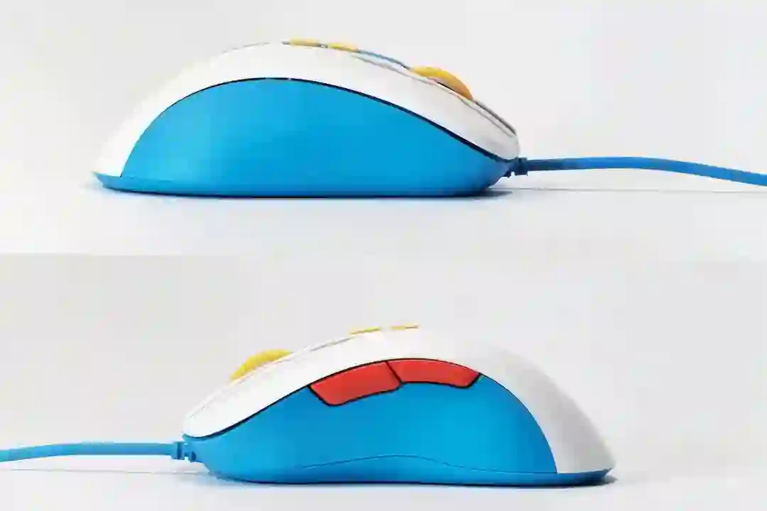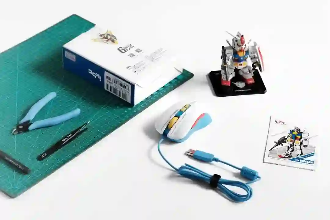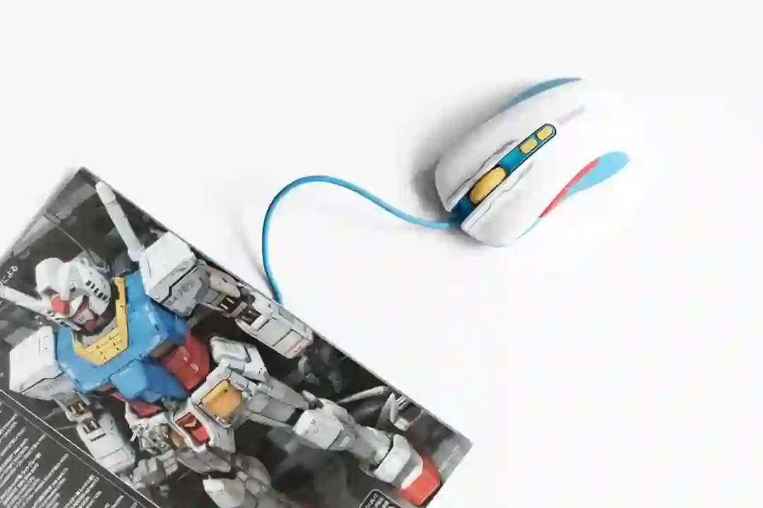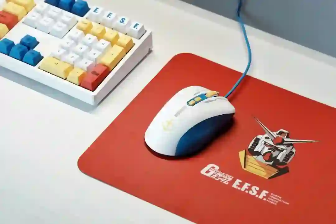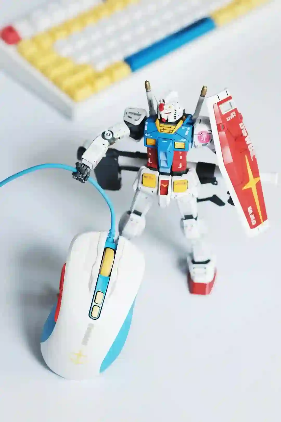 接着再来看看鼠标,说实话 ikbc 一直给我的印象都是以做键盘为主,鼠标这条产品线出品真不多,这款高达定制款光磁鼠标算是一个新的尝试,配色整体和键盘呼应,也是采用了RX- 78-2 机体上的红蓝黄白4种颜色,并且顶部也印有 “ RX-78-2 ”、“ GUNDAM ” 字样以及地球联邦宇宙军的 logo,和 MG 元组 3.0 放在一起,差点就以为鼠标上的这些图案也是水贴印上去的了。