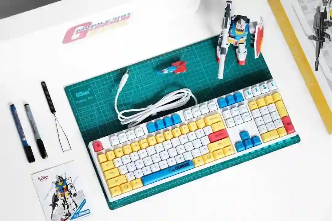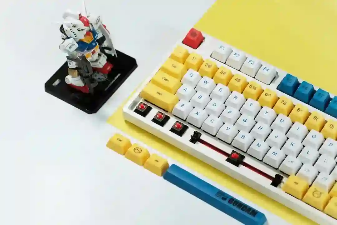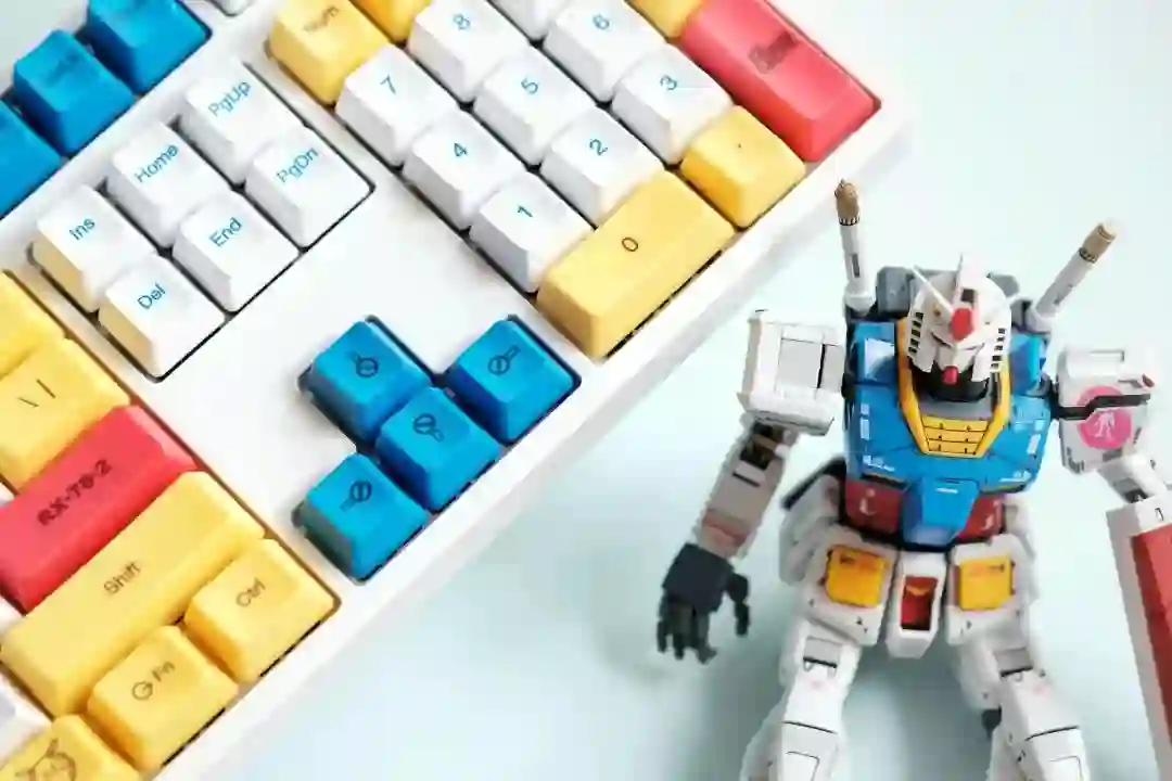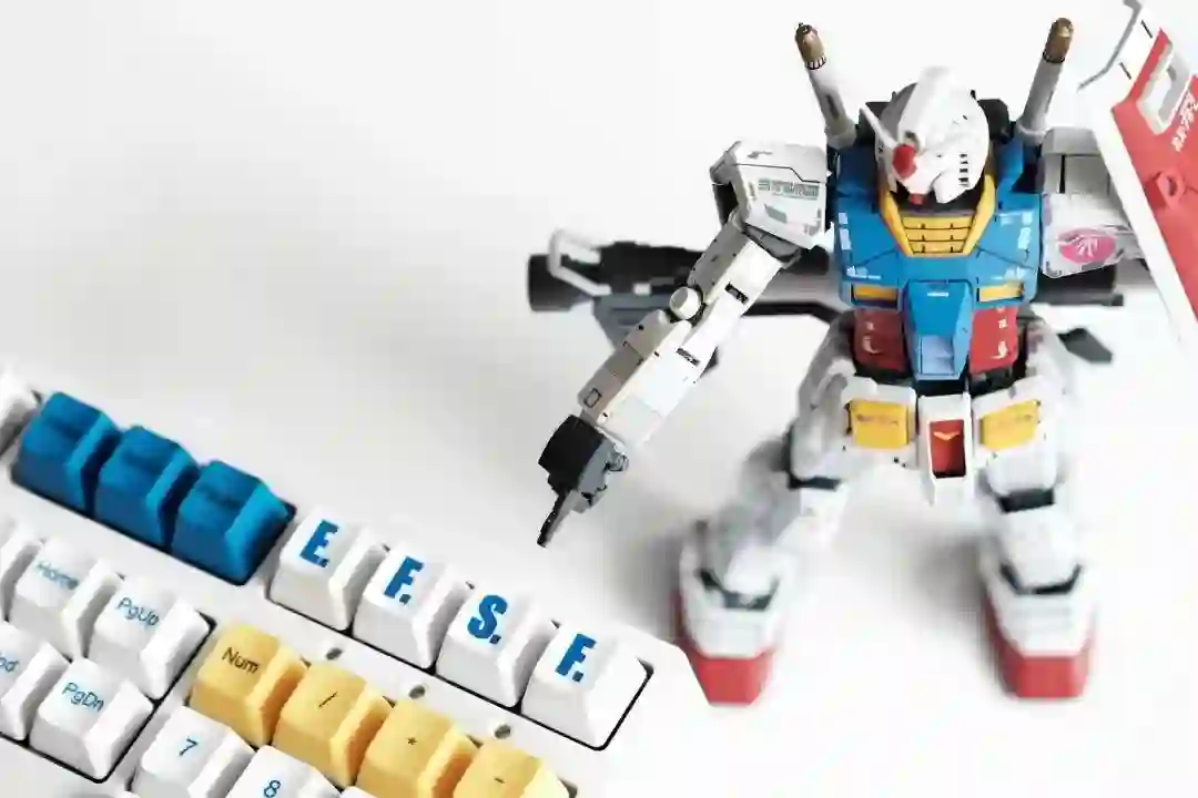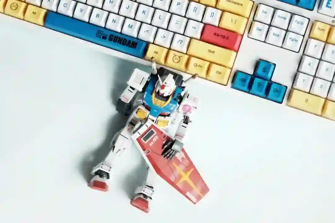 先来说说键盘,采用了 108 键设计,在 104 全键基础上再增加了 4 个多功能键,键帽采用 PBT 材质,配色以红蓝黄白为主,这也是 RX-78-2 机体的经典配色。除了配色之外,键帽上的图案也采用了非常多的经典高达元素,我们不妨来来一起看看 ikbc 给了我们多少彩蛋: