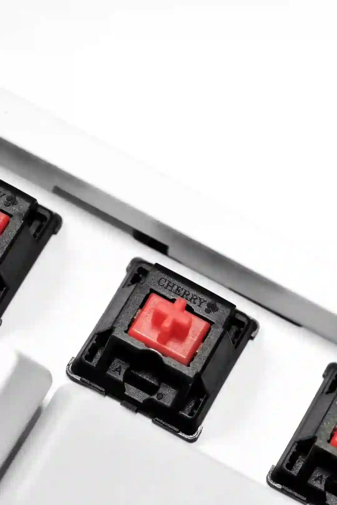 怎么样,全部的元素罗列出来还是挺多的吧!说完了外在,我们再来看看这把键盘的内里,利用拔键器轻松拔起任意键帽,可以看到这款键盘的轴体是采用了德国 CHERRY 原厂的 MX 红轴,这款轴的最大优点就是寿命非常长,敲击感非常轻,直上直下,没有段落感,对于文字工作者或者游戏爱好者都是非常友好的。