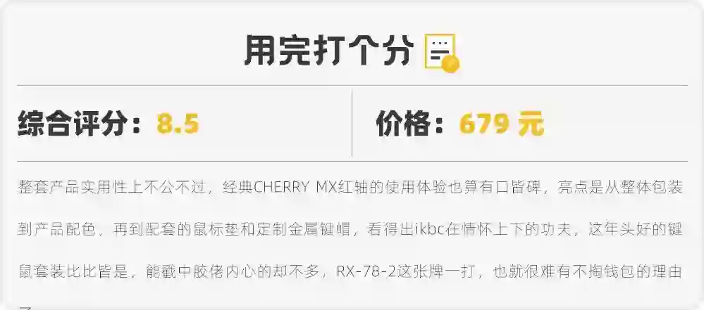 大概使用感受就是这么些,可能有些人还会说这键盘的高达定制元素都是停留在包装和键帽图案上,直接出一套键帽不就好了,考虑到这是 ikbc 拿到 SUNRISE 官方授权后的第一套高达定制产品,比较保守也在意料之中,况且你买套键帽不也得 200 起步啊,深度定制的款肯定有,人家可签了一年的授权呢,好戏估计都在后头,然而小孩子才做选择,成年人肯定是都要,至少现阶段来看,这套套装我觉得挺香!