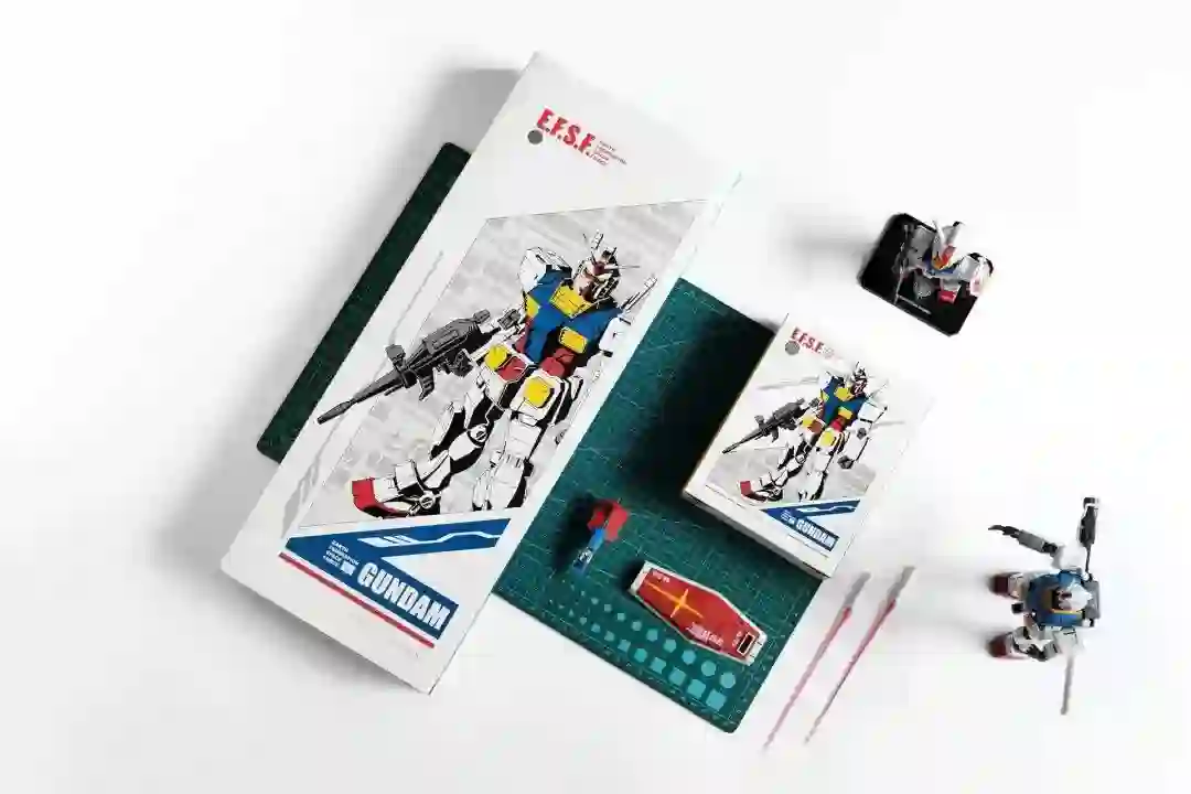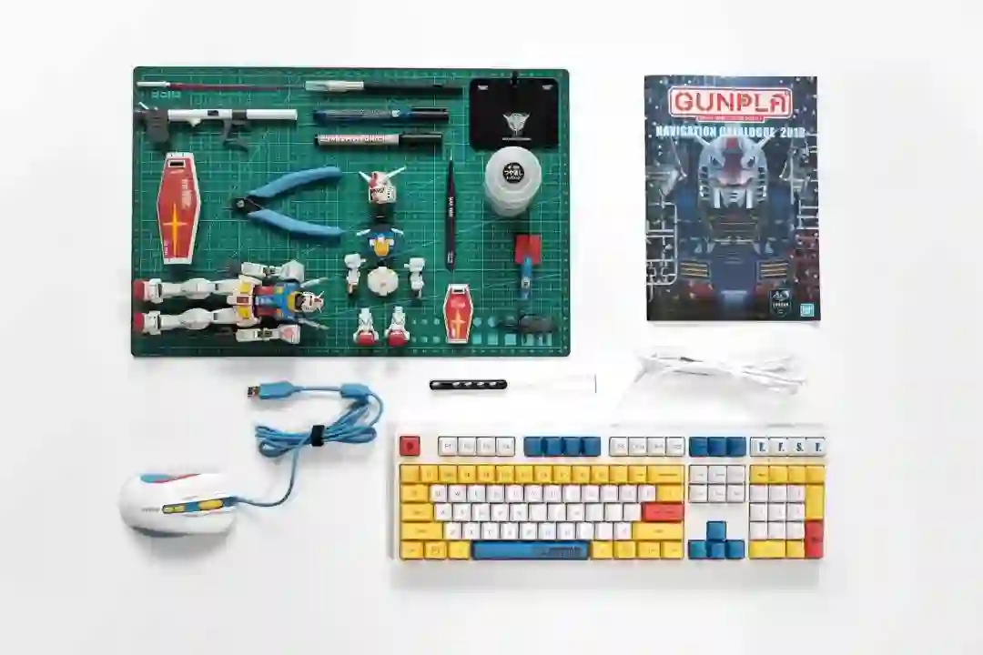 虽说是套装,但是键盘和鼠标是分开包装的,如果你玩胶时也是个盒控,那你绝对能体会盒体八角尖尖的快感。这套键鼠的外包装设计十分一致,简单直白的 RX-78-2 的形象搭配黄蓝白的配色,确实是地地道道的元祖口味没错。