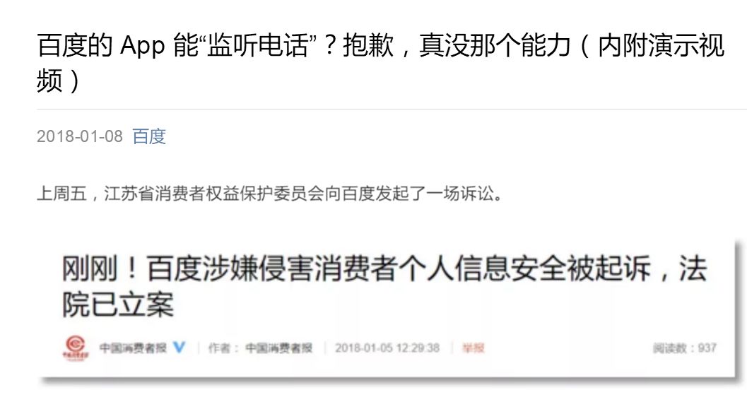 近日,江苏省消费者保护委员会(下称江苏消保委)起诉百度旗下两款App“手机百度”、“百度浏览器”在安装后,未经用户同意越界获取“监听电话”等权限的消息传得沸沸扬扬。昨日,百度就江苏消保委起诉百度一事,展开了媒体沟通会。