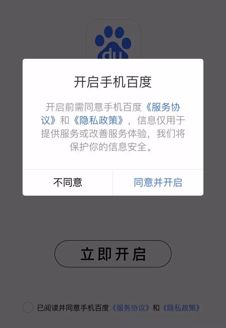 初次安装手机百度App时,页面都会提示默认勾选“已阅读并同意手机百度《服务协议》和《隐私政策》”,如取消勾选则无法使用该应用。那么,这就造成了一种强制性,如果不同意该协议就无法安装App,但如果仔细阅读以上《服务协议》就可以发现:一旦用户使用App产生的数据则是归企业所有,而App就这样“合理合法”有了获取用户信息的途径。