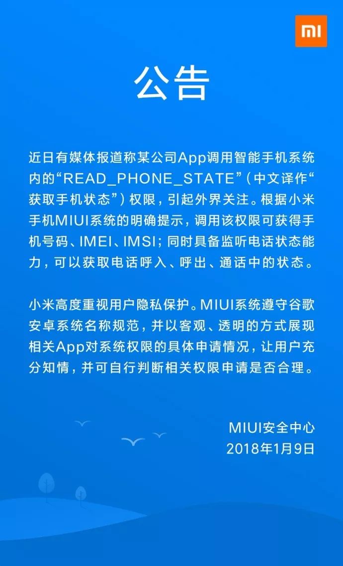 小米:“调用智能手机系统内的"READ PHONE STATE" 权限可获得手机号码、IMEI、MSI;同时具备监听电话状态能力以获取电话呼入、呼出、通话中的状态。”