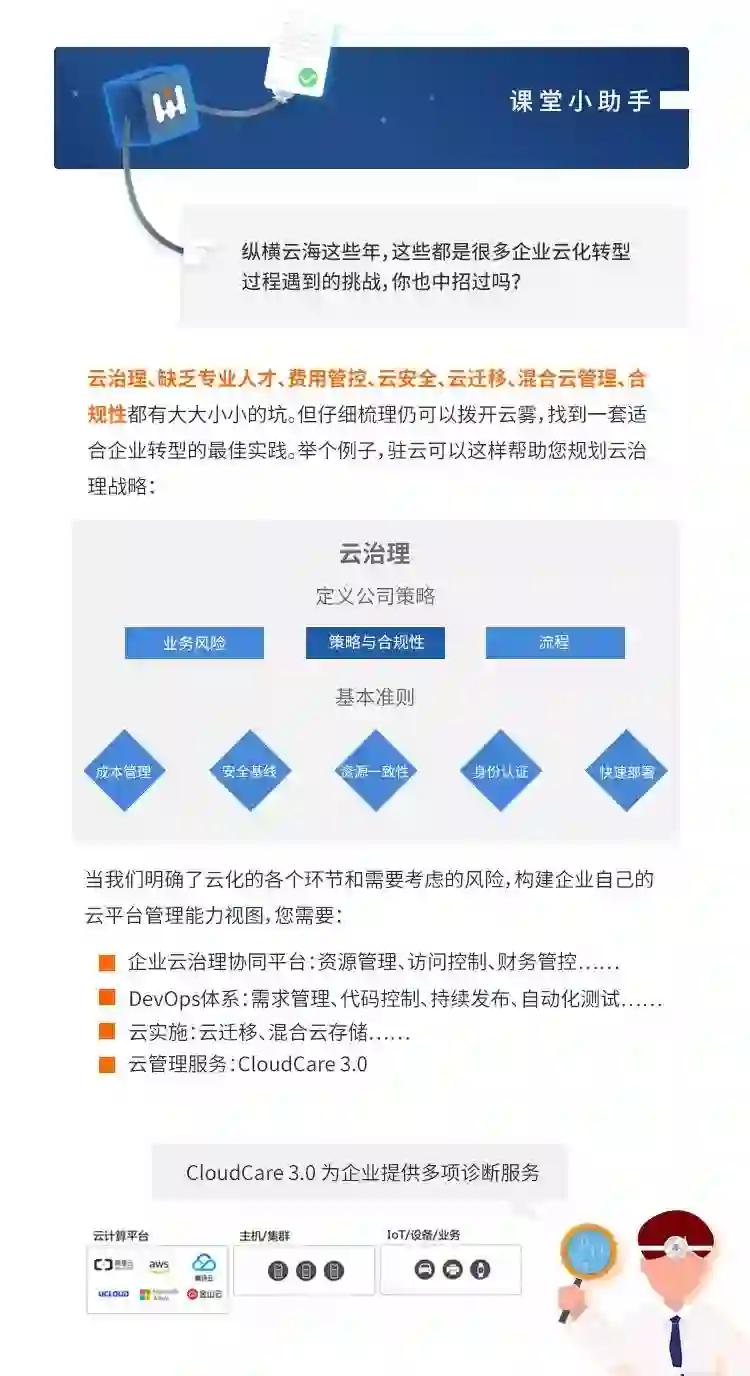 在运营阶段,我们可以帮助企业实现自己的运维管理、安全、人员培训,甚至于提供各种各样的解决方案,来解决特定场景下的问题。同时我们还有一些资源管控工具,刚刚我已经讲了,包括监控工具和监控诊断规则等等。