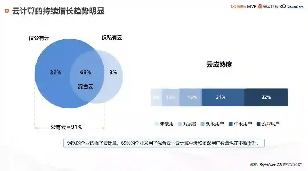 我们再来看一下整个云计算的持续发展的状况,这个数据是来源于RightScale《2019年云状态报告》,在整个调研的企业对象中,94%的企业是选用了云计算。其中91%是公有云的用户,69%是采用了混合云的模式。非常重要的一点,云计算中级和资深用户数在不断的提升,达到了63%。什么是中级用户?中级用户是指有多个应用已经在部署在公有云上了,而且有一部分是关键性应用,并且正处于一个不断拓展云的使用力度的阶段。资深用户是指一些重度云计算的使用者。他们不仅只关注业务的问题,也在逐步的探索和优化云管理和费用的方式。这些中级和资深的用户在整个云计算的比例达到了63%,而且这个数字相对于去年有一个很大的提升。