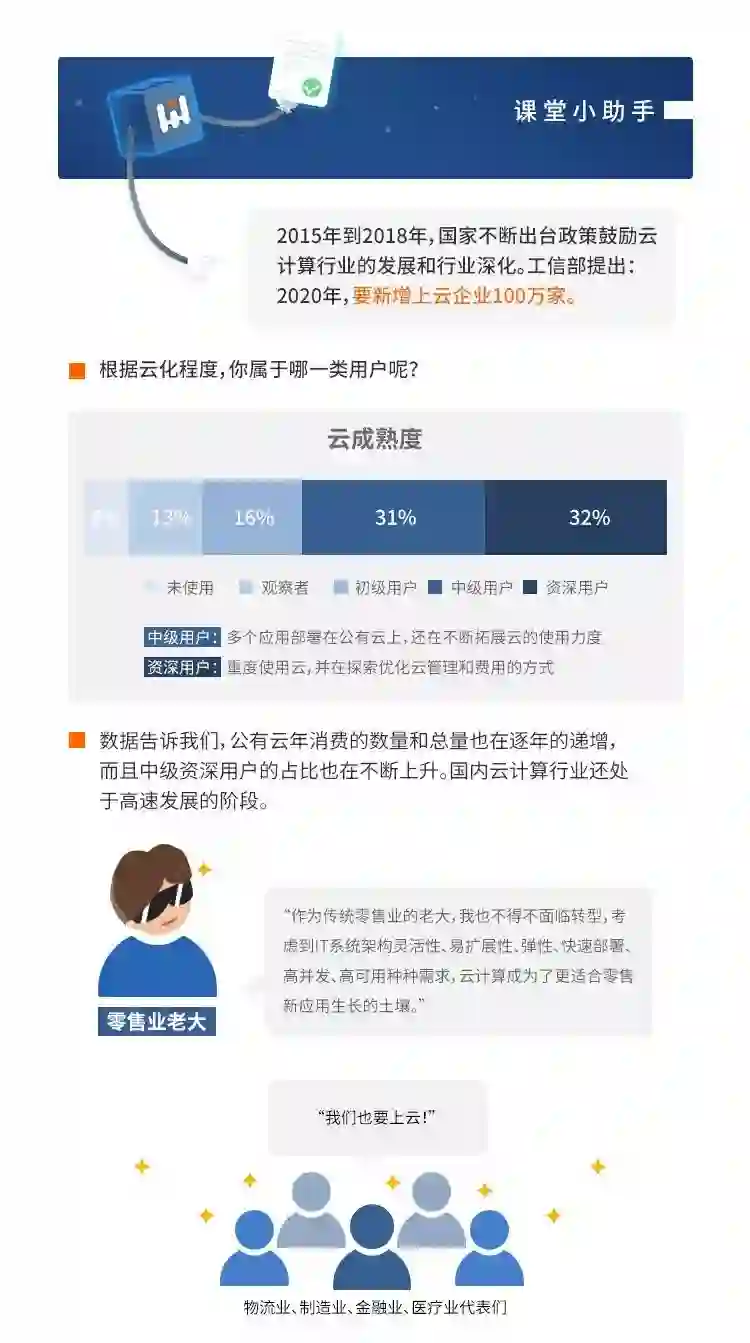 2018年,工信部又印发了《推动企业上云实施指南》,明确提出了到2020年,要力争实现企业上云环境的进一步优化,上云比例和应用的深度要显著提升,而且要新增上云企业100万家。这说明对于企业而言,云化它不仅是自身战略发展的需要,也是和国家战略发展相一致的。