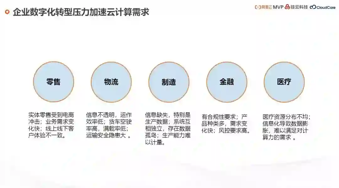 这同时对于一个IT系统架构也提出了挑战,像灵活性、易扩展性、弹性、快速部署、高并发、高可用等等,这些让云计算成为了更适合零售新应用生长的土壤。在物流、制造、金融和医疗行业也存在着各种各样的问题。这些问题在某种程度上驱使着企业去通过云计算,来实现自己自身的数字化转型的能力。