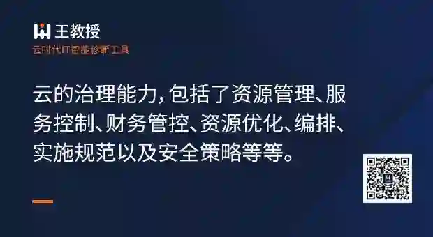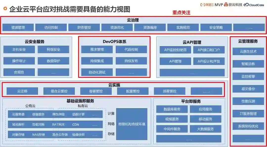 最上面就是云的治理能力,包括了资源管理、服务控制、财务管控、资源优化、编排、实施规范以及安全策略等等。