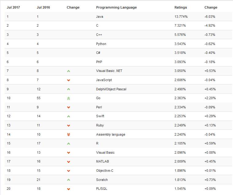 看看还有多少人依然坚守在 Java 的针线上。TIOBE 发布了 7 月编程语言排行榜,Go 语言今年一路飙升,终于在 7 月进入前 10 名。相比之下, Kotlin,Elixir 和 Hack 作为三门新兴语言本月排名并未提升。值得注意的是,“老将” Java 虽然仍稳稳占据着榜首位置,但却下滑了6.03%,为本次跌幅最大的编程语言。
