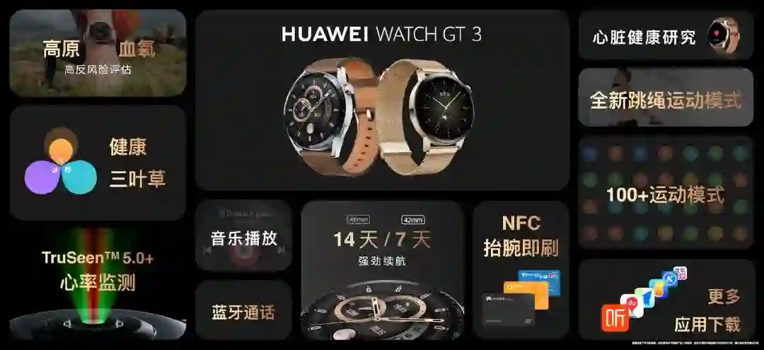 华为WatchGT 3 采用了高分子纤维后壳和高清 OLED 显示屏,搭配 Truseen™5.0+,提供全天候心率、睡眠等多维度健康管理,还支持全天候血氧监测,后续升级支持高原血氧监测。搭载 Harmony OS,可实现蓝牙通话与消息回复、离线独立播放音乐、轻松唤醒智能生活助手等操作。46mm 在重度场景可续航 8 天,在典型场景可续航 14 天;42mm 在重度场景可续航 4 天。华为 WatchGT 3 46mm 款分别提供了活力款、时尚款、尊享款,其售价为 1588 元起;华为 WatchGT Runner 42mm 款分别提供了活力款、时尚款、雅致款,售价为 1488 元起。