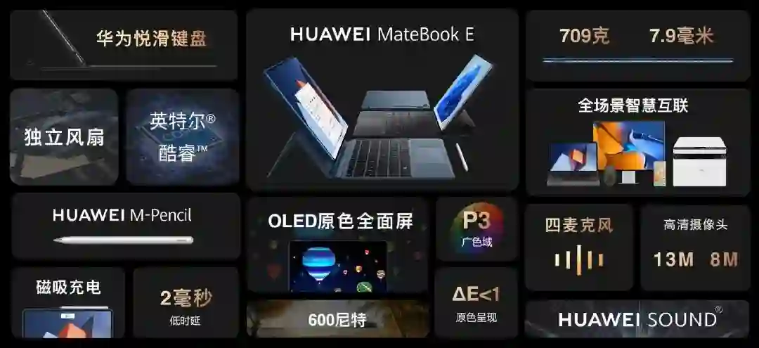 HUAWEI MateBook E 携 Windows 11 登场,该二合一笔记本电脑还是华为首款采用 OLED 原色全面屏的笔记本产品,其屏幕亮度最高可达 600 尼特。HUAWEI MateBook E 搭载第 11 代英特尔酷睿处理器,且具备 65W 便携快充、标配 Thunderbolt 4 接口、指纹解锁、高清前后置摄像头、四麦克风智能降噪。该笔记本还搭配 HUAWEI M-Pencil,最低 2 毫秒时延,最长支持连续写画 10 小时。HUAWEI MateBook E 提供三个配置版本,i5-1130G7 / 8GB +256GB 组合售价 5999 元,其余配置分别为 6999 元和 7999 元。