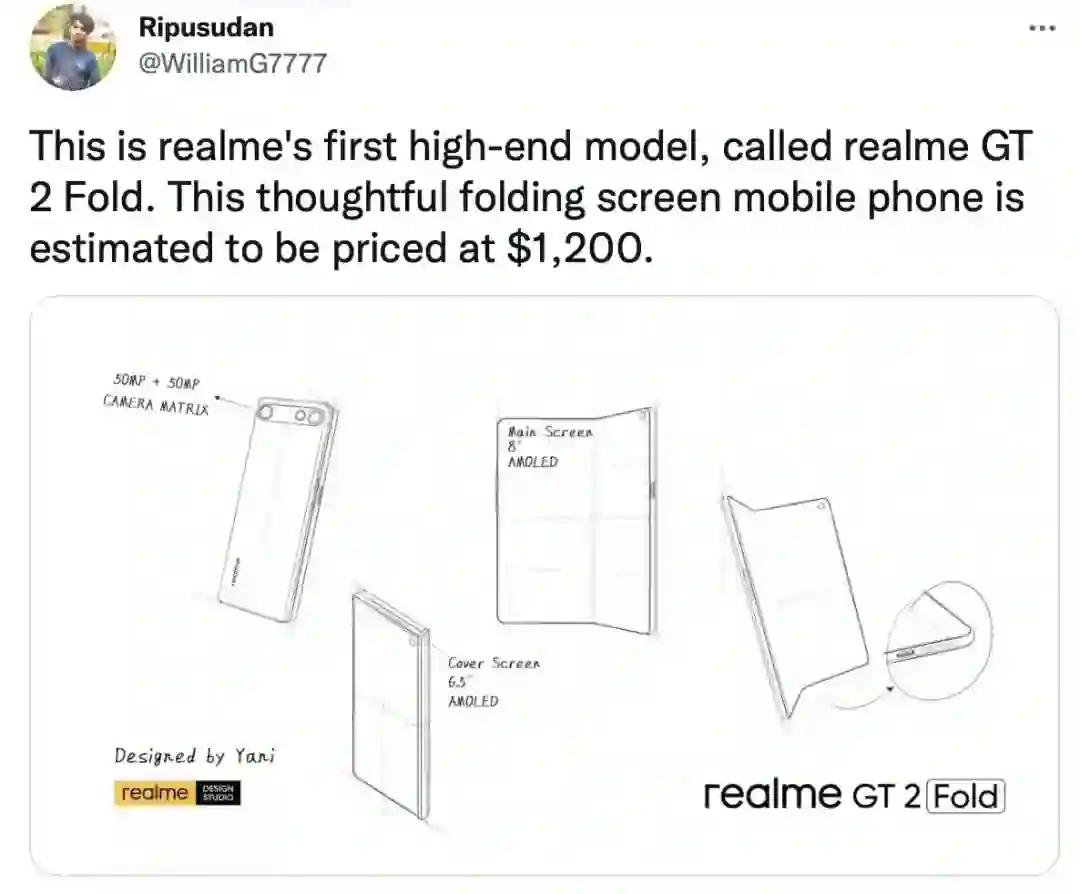 realme 副总裁、中国区总裁徐起今天发微博表示,2022 年高分辨率高素质的挖孔屏将成为主流,屏下,折叠等新形态将进一步趋于成熟。此外,海外博主 @WilliamG7777 今日爆料,realme 要冲击高端市场,而且要进军折叠屏手机领域,价格可能在 1200 美元以上(约合人民币 7700 元)。