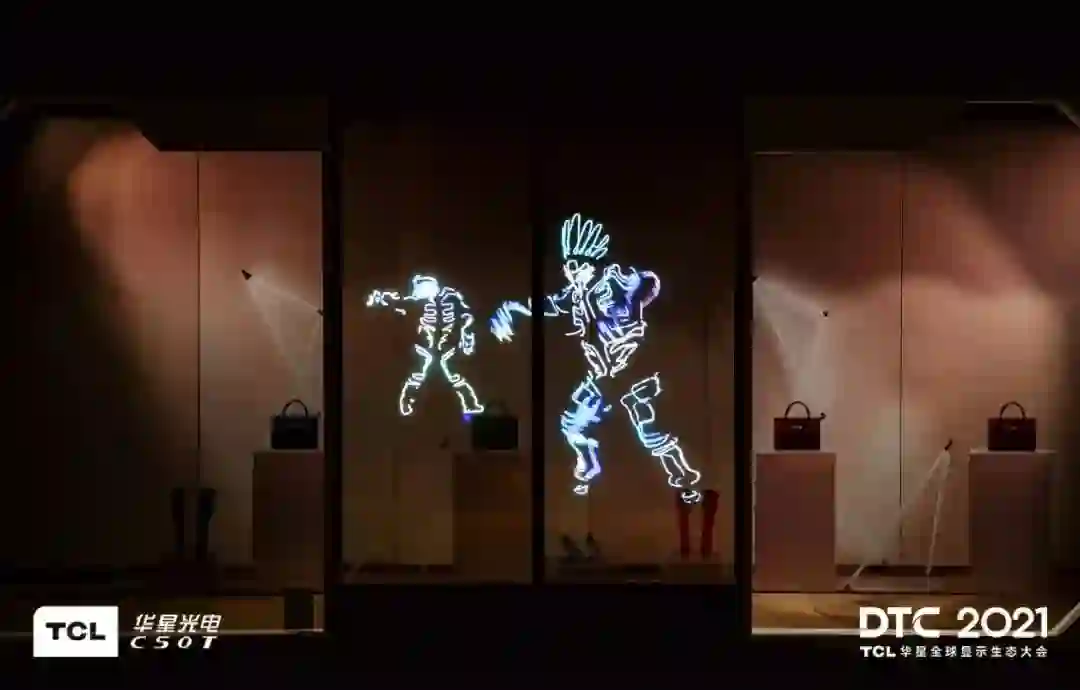全球首款 125" 玻璃基透明直显 MLED 显示屏,该屏幕采用了玻璃基主动式的驱动方式;以 25”单体作为最小的拼接单元,利用 TCL 华星高精度玻璃拼接技术,实现了大尺寸拼接的透明形态。